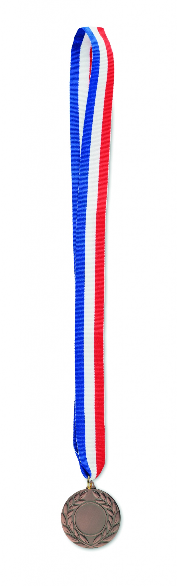 Medalj av järn med polyesterband i färgerna blått, vitt och rött. 5 cm i diameter