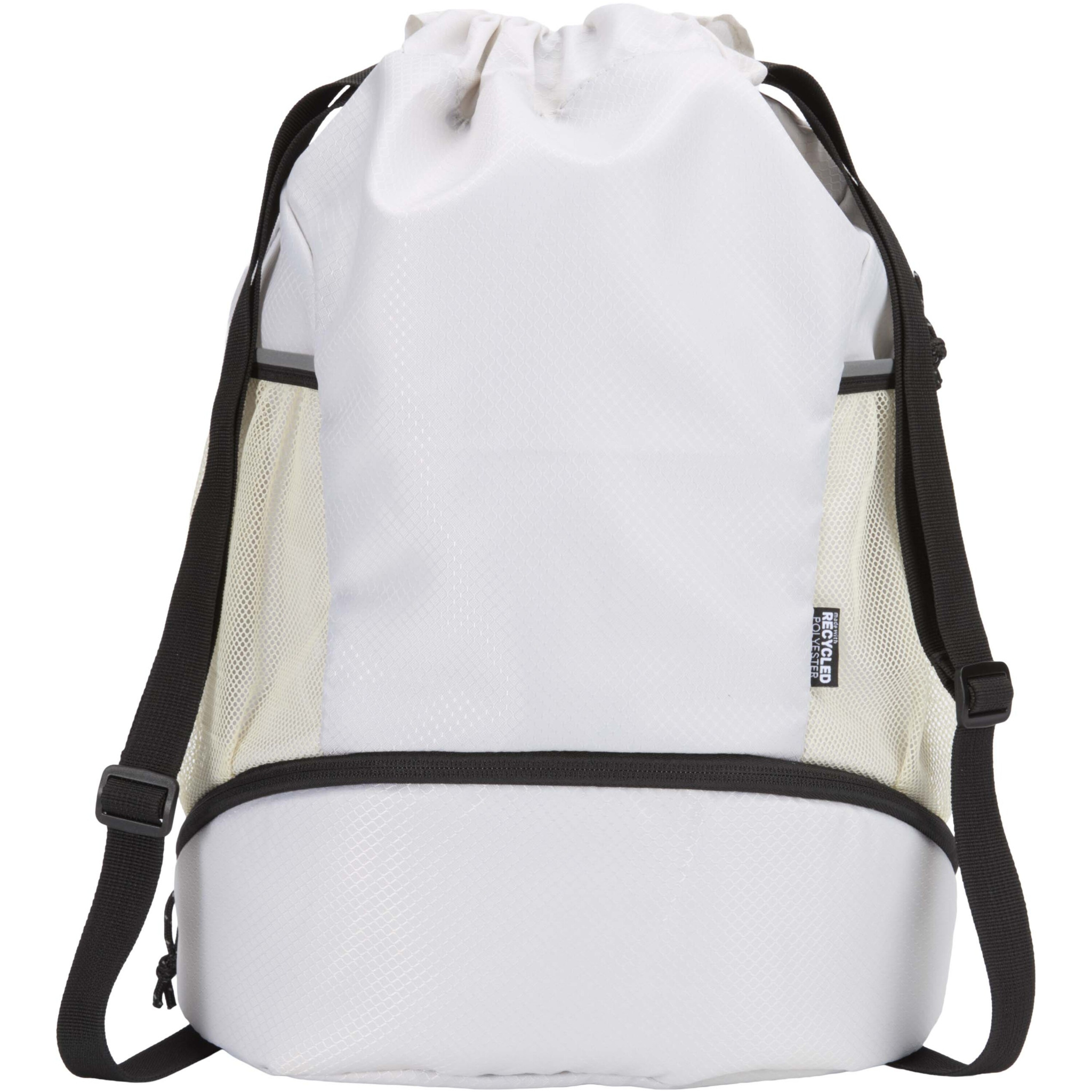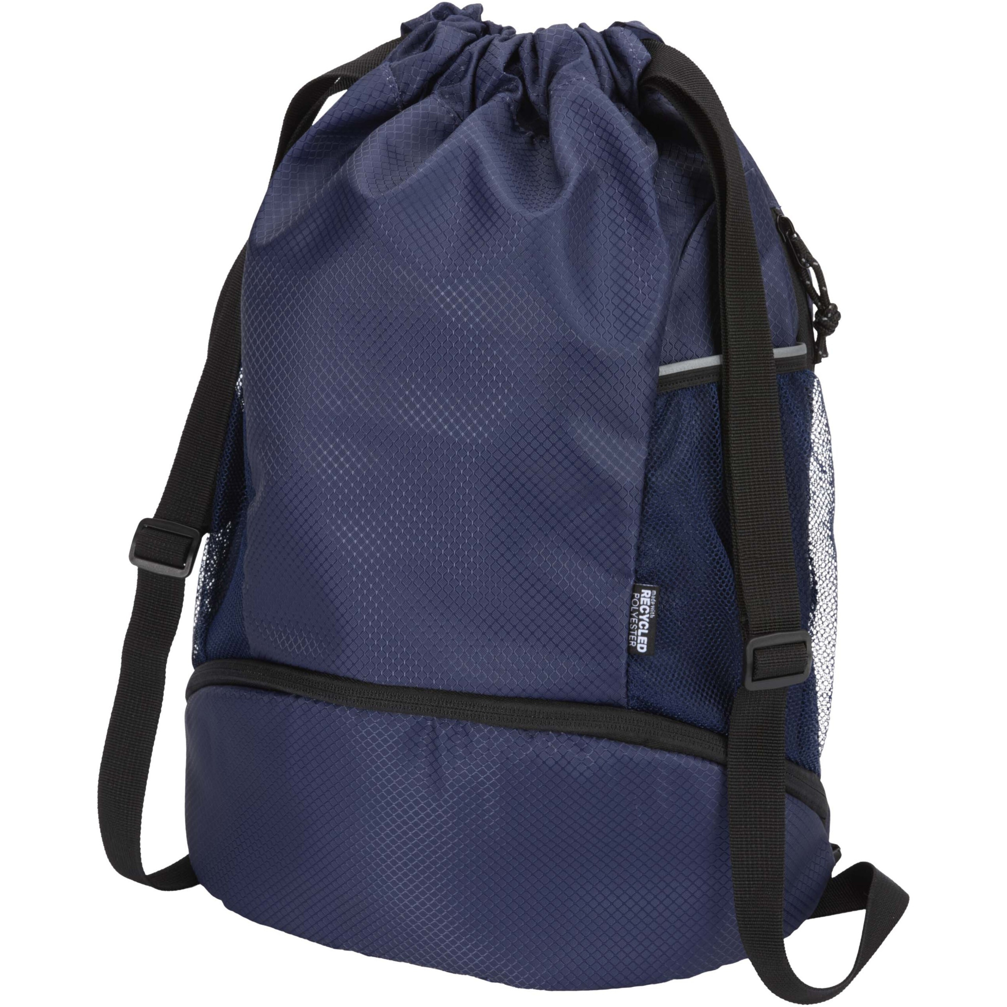 Sportväskan Nomad med dragsko är tillverkad av GRS-certifierat återvunnet ripstopstyg med en vattenavvisande yta, GRS-certifierat RPET-foder och reflekterande element. Den är utformad för personer med en aktiv livsstil och lämpar sig för daglig träning och sportaktiviteter. Väskan har ett rymligt huvudfack som rymmer kläder, en handduk eller till och med en basketboll. Ett separat bottenfack håller skor eller använda kläder åtskilda från andra föremål. Den har också två sidofickor i mesh med reflexdetaljer, en dold ficka med dragkedja för värdesaker och justerbara axelremmar med vävband för bekväm bärning.