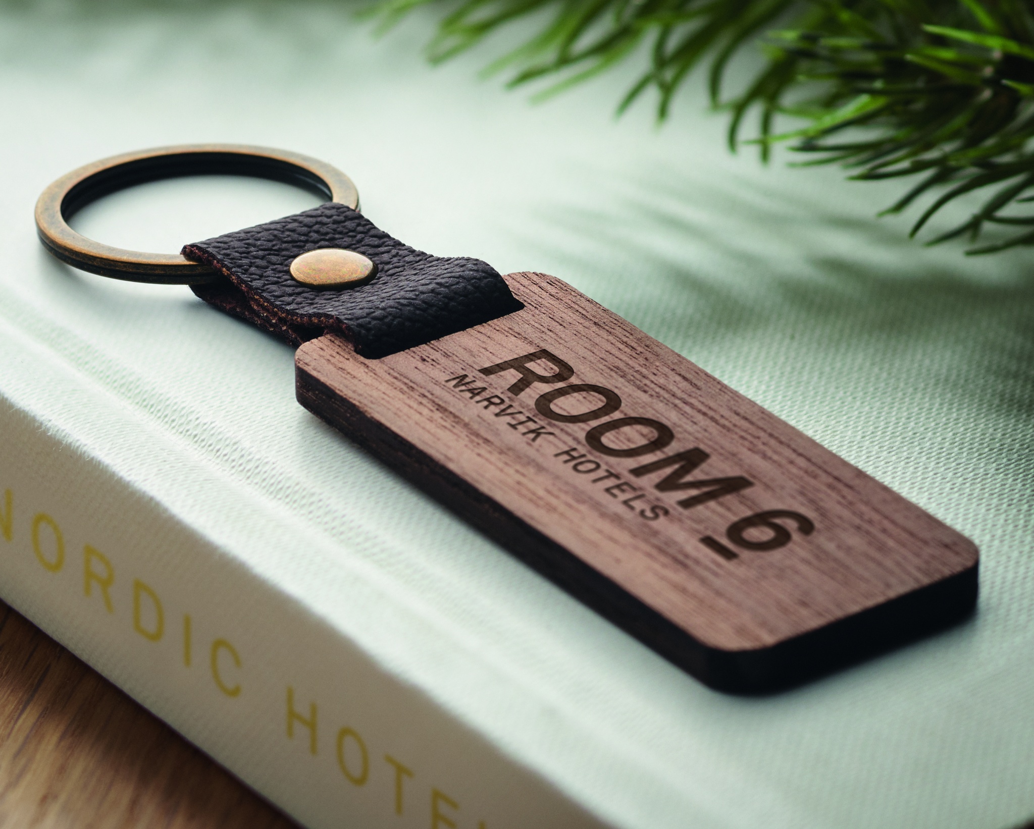 Logotrade kampanjprodukter bild: Nyckelring i valnöt och PU Kokkola