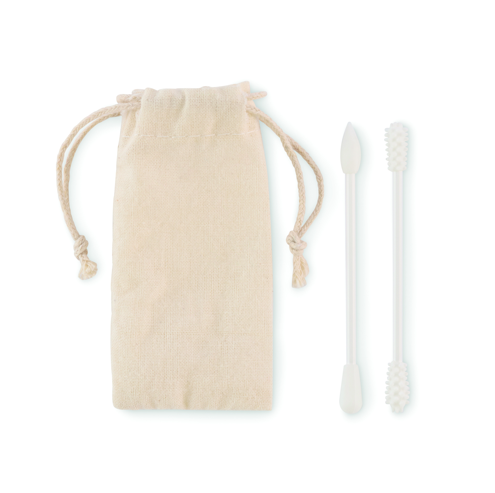 Set med 2 återanvändbara och tvättbara silikonpinnar med 3 olika huvuden. Levereras i bomullspåse med dragsko.