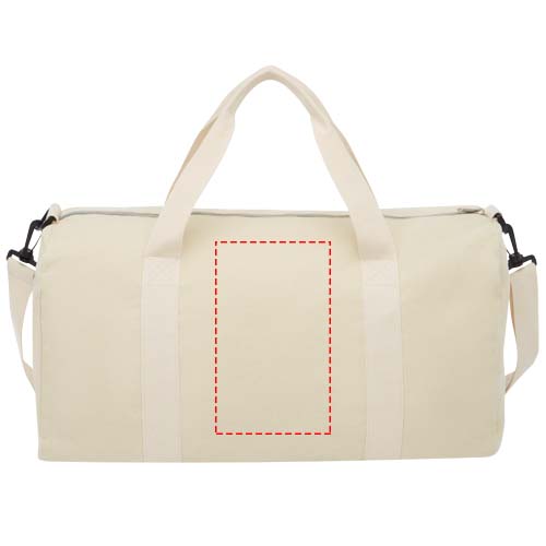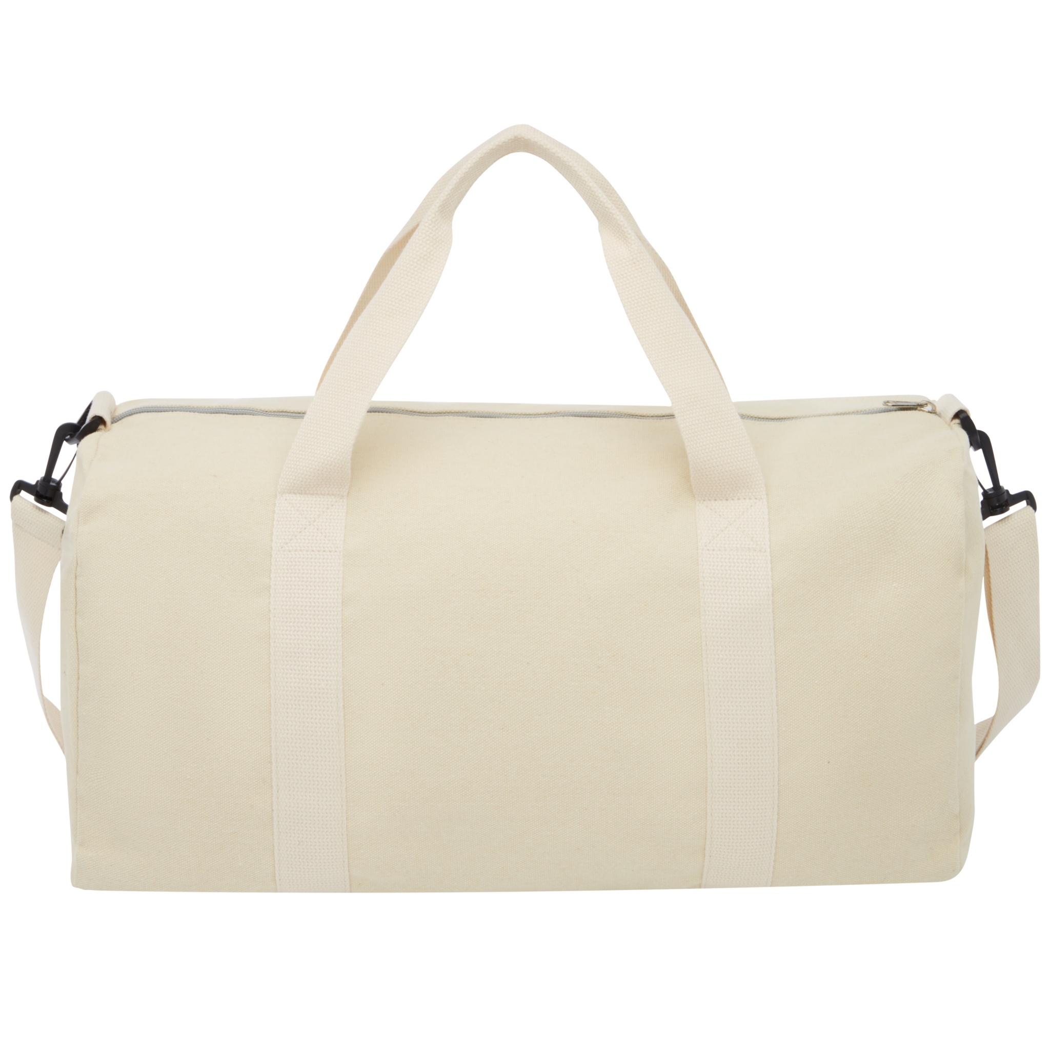 Duffelväska i återvunnen bomulls- och polyesterblandning med justerbar axelrem. Återvunnen bomull är tillverkad av konsumentavfall som genereras av textilfabriker under skärprocessen. Liknande färger blandas ihop, vilket innebär att ingen ytterligare färgning krävs. Det kan finnas mindre variationer i färgen på den faktiska produkten på grund av produktionsprocessens art. Denna funktion ger tydligt ett mer autentiskt utseende.