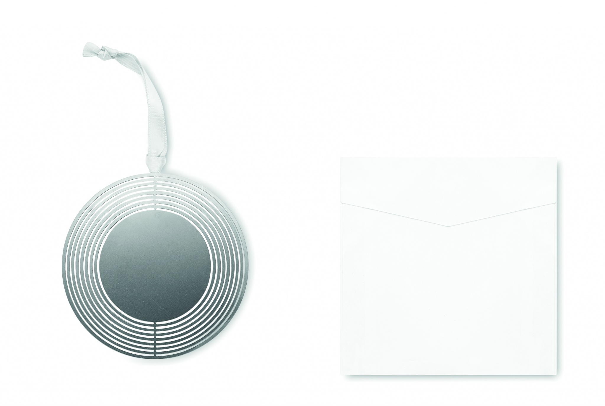 Rund dekorativ julprydnad i rostfritt stål med band i presentkuvert. Levereras platt för att enkelt skickas i brev och fälls sedan upp till en boll.
