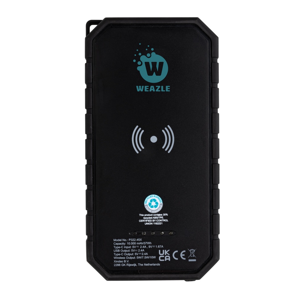 Snabb 10.000 mAh solcellspowerbank med 10W trådlös laddning tillverkad av RCS (Recycled Claim Standard) certifierad återvunnen ABS och TPE. Totalt återvunnet innehåll: 30% baserat på total produktvikt. RCS certifiering säkerställer en helt certifierad leveranskedja av de återvunna materialen. Powerbanken stödjer laddning både via kabel (type C och USB) och 10W trådlös snabbladdning. Trådlös laddning är kompatibel med alla QI-aktiverade enheter som senaste generationen Android, iPhone 8 och upp. Den har en solscellspanel, ficklampa och karbinhake. IPX5 vattentät. Med batteriindikator. Type C laddningskabel i GRS certifierad återvunnen TPE medföljer. Levereras i FSC® mix kraft förpackning. USB Output: 5V/2.4A; Type C Output: 5V/2.4A. Produkt och accessoarer är 100% PVC-fria.