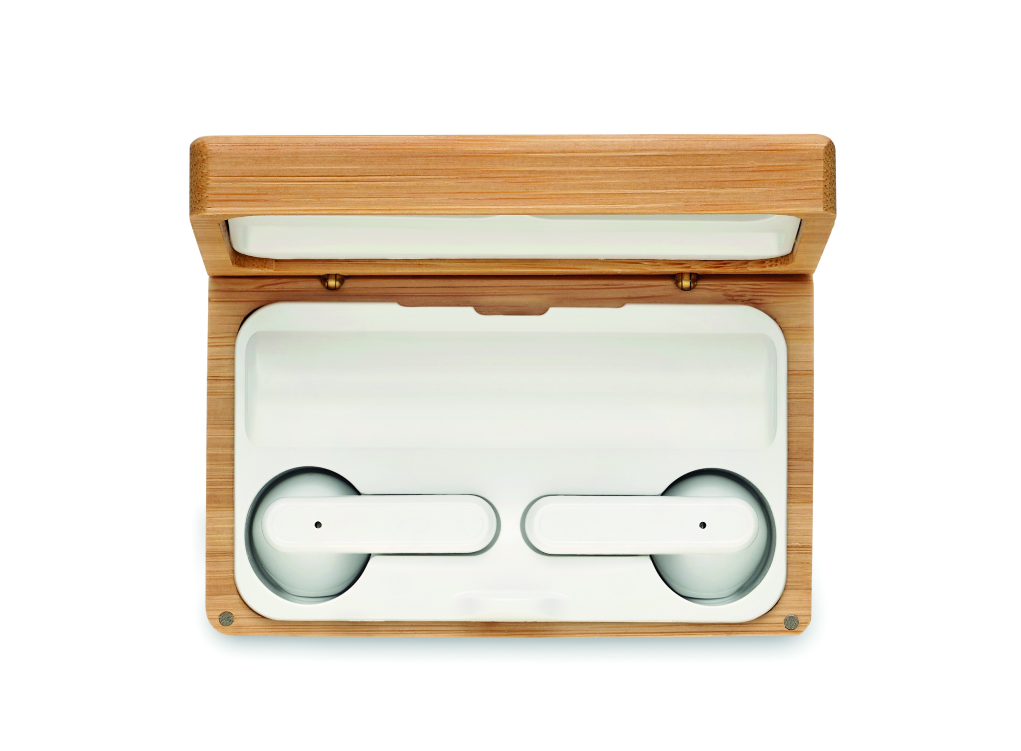 Logotrade reklamprodukter bild: TWS-headset i bambufodral
